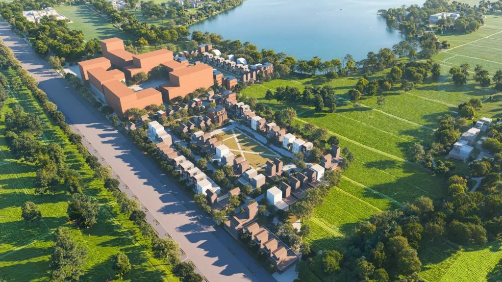 Large-scale residential masterplan with lush open green spaces, water bodies, and carefully planned roads for privacy and walkability. Focus on creating wellness, productive, and sustainable urban living.